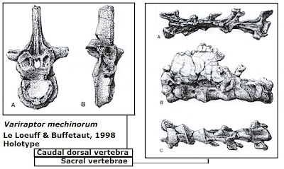 Beaucoup à déjà été dit sur la validité du genre Variraptor et sur le fait qu'il soit oui ou non un synonyme de Pyroraptor, mais un petit rappel de son historique ne fait pas de mal. Variraptor est fondé (par Le Loeuff et Buffetaut en 1998) sur une vertèbre dorsale postérieure articulée à un sacrum (holotype), un fémur et un humérus isolé du site de Bastide Neuve (Var). Deux vertèbres (une cervico-dorsale et une sacro-caudale) provenant du site de Roques-Hautes (Bouches-du-Rhône) lui ont aussi été attribuées (la sacro-caudale ayant paraît-il exactement la même forme que la 5ème vertèbre du sacrum varois).